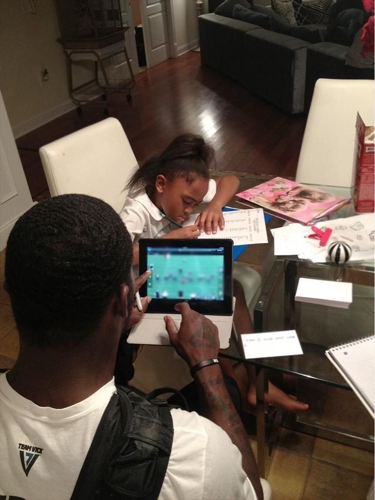 The photo featured Vick sitting at the table studying film and his daughter sitting with him doing homework. The box of Milk-Bones happened to be on the right edge of the picture. Interestingly enough, the tweet was later deleted and reposted later with a cropped photo that did not include the dog treats.