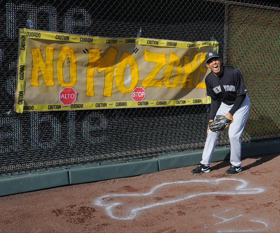 Rivera's teammates had a friendly prank waiting for him as he returned to the "scene of the crime", with a chalk outline in the spot where he fell and a sign with a border made of police caution tape reading No "Mo" Zone. Based on the photo, Rivera got a good laugh out of it.